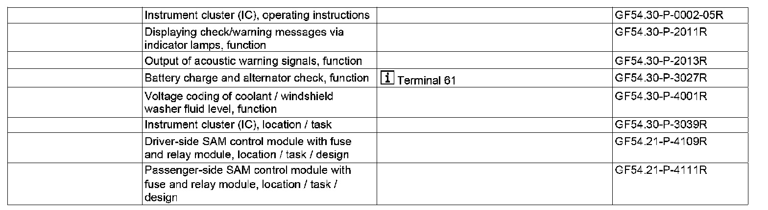 This category 3 message is displayed when the level of washer fluid for the windshield and headlamp cleaning system drops below the minimum. This information is transmitted over the interior compartment CAN from the passenger-side SAM control module (N10/11). For further details, refer to "Voltage coding of coolant / windshield washer fluid level, function".