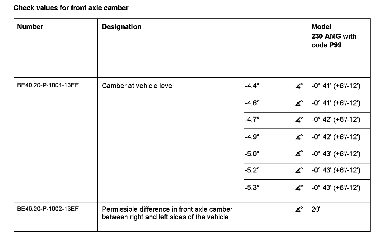 Check values for front axle camber: