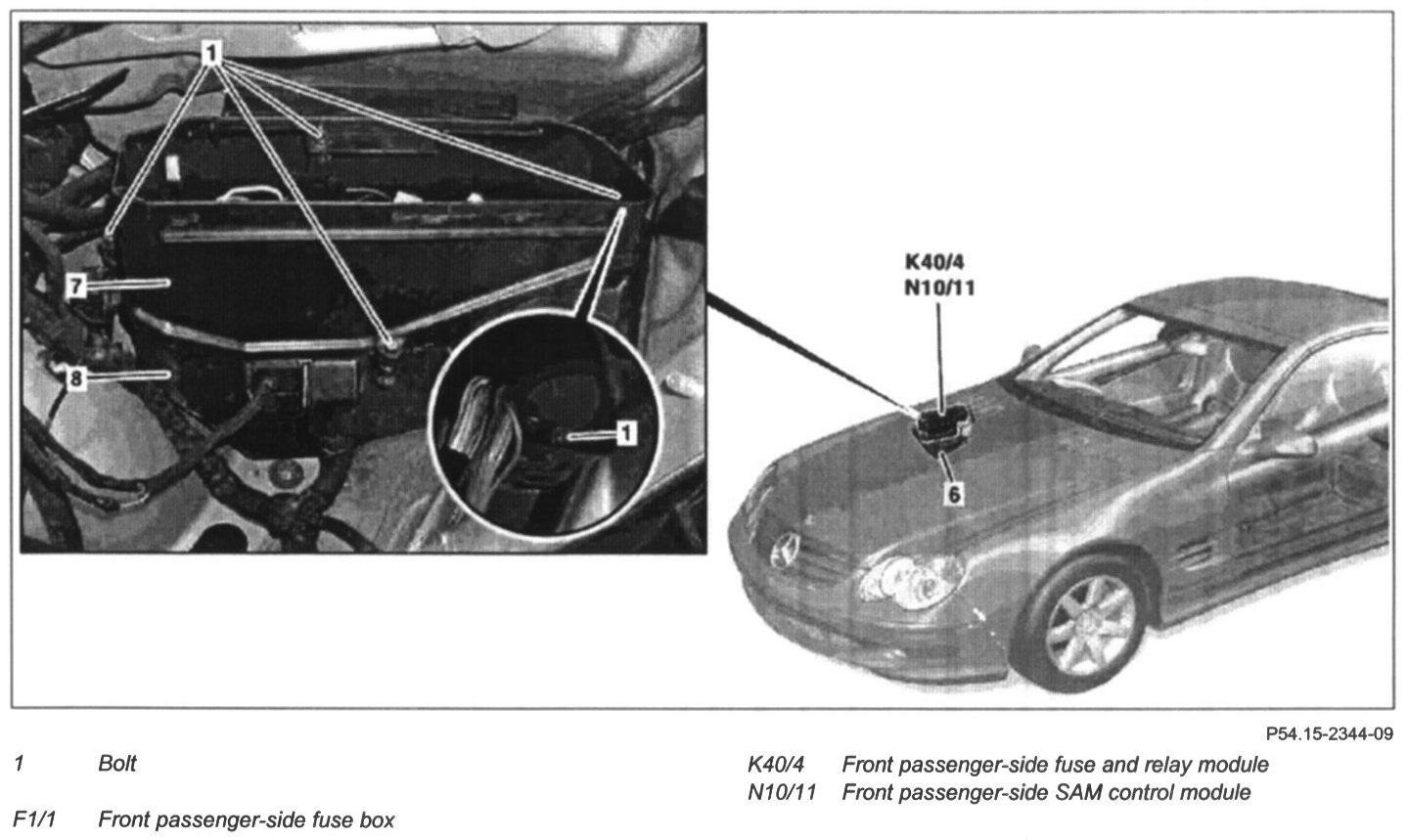 4 Remove front passenger-side SAM control module (N10/11) with right front passenger-side fuse and relay module (K40/4)