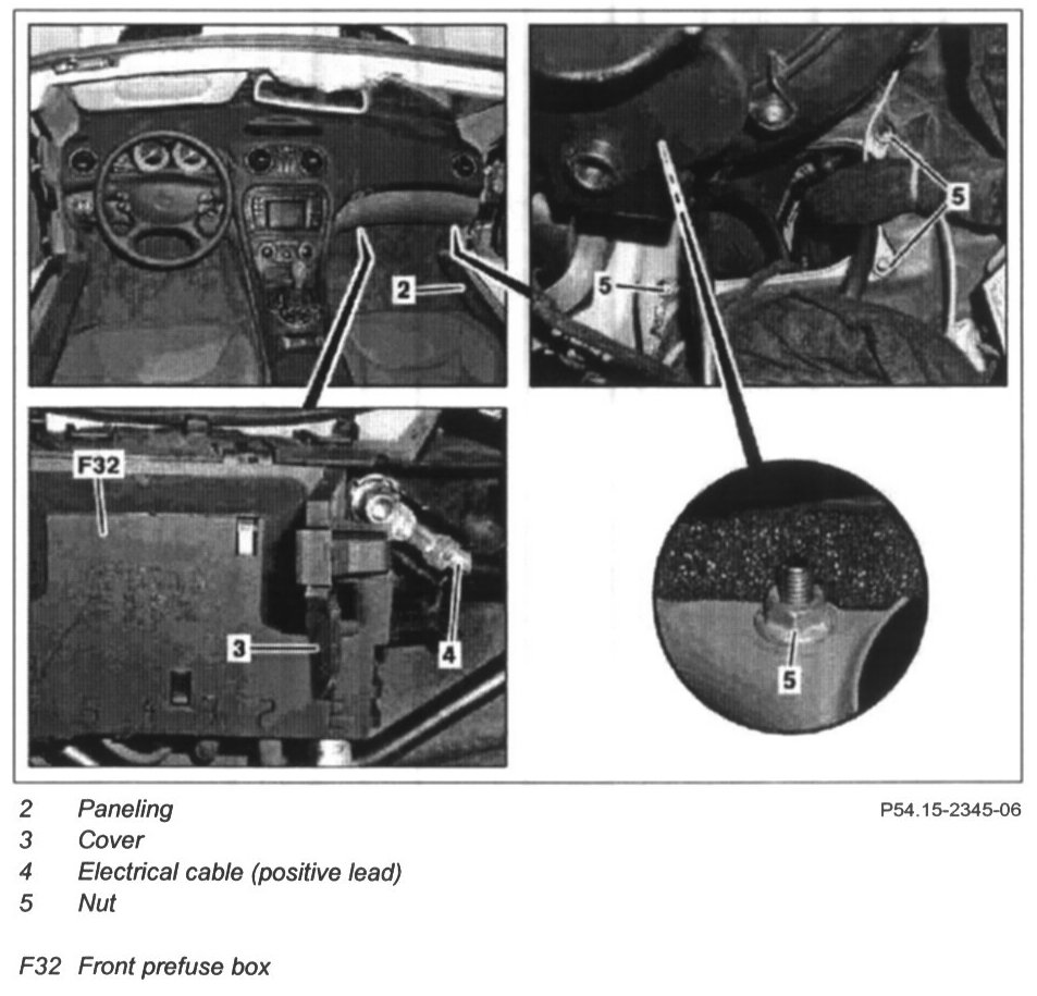 12 Open cover (3) and unscrew electrical cable (positive lead) (4) from front prefuse box (F32)