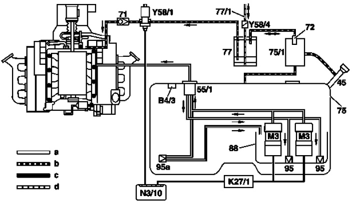 The fuel pump (M3) suctions the fuel from the swirl pot (55/4) in the fuel tank (75) and delivers it to the fuel filter (55), where contamination is removed. The fuel pressure is detected by the fuel pressure regulator (B4/7) after the fuel filter and is limited to approx. 5.0 bar via the fuel pressure regulator (55/2).