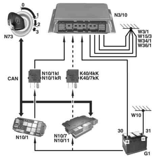 The ME-SFI [ME] control unit (N3/10) is supplied with voltage directly from the battery on-board electrical system battery "unfused".