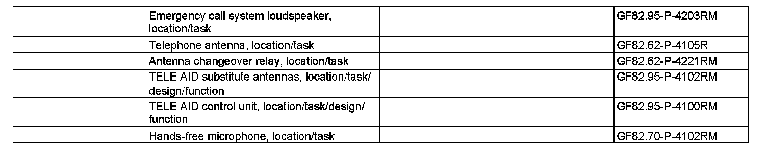 The hands-free system microphone group (A67b1) is used for voice input. Voice output occurs exclusively over the left front emergency call speaker (H4/46) and the right front emergency call speaker (H4/47). Both speakers are actuated discretely by the emergency call system control unit (N123/4). Normally, the telephone connections are established via the telephone antenna (A2/22). If the standard telephone antenna should happen to malfunction (A2/22), such as due to the a vehicle rollover, there is also a TELE AID backup antenna located in the area of the rear shelf (A2/50). The emergency call system control unit (N123/4) detects the failure of the telephone antenna and then automatically actuates the TELE AID backup antenna (A2/50).