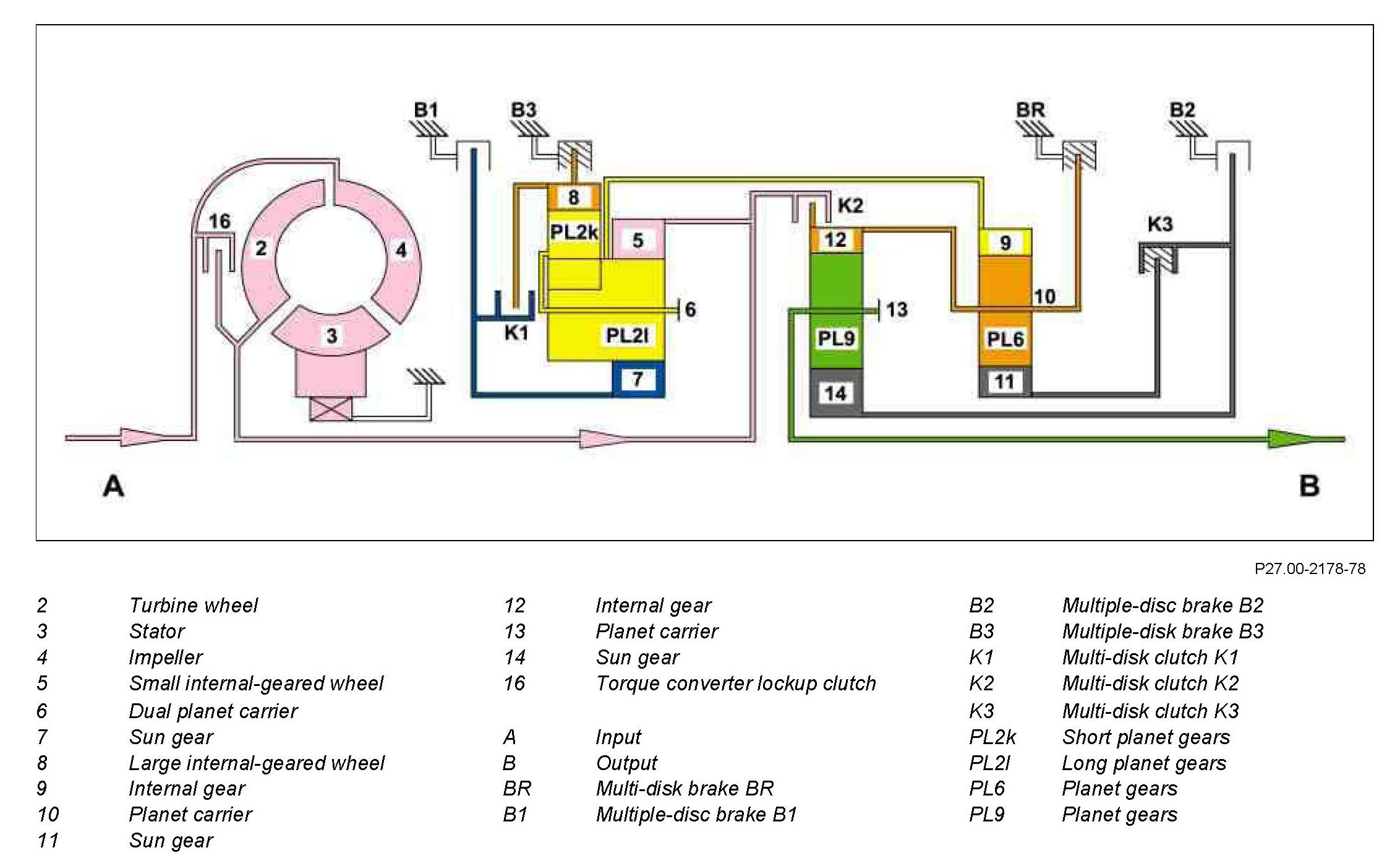 The small internal-geared wheel (5) is driven via the transmission input shaft. The long planet gears (PL21) drive the short planet gears(PL2k) which roll in the stalled large internal-geared wheel (8). The increased torque and reduced rotational speed as a result are transmitted to the dual planet carrier (6).