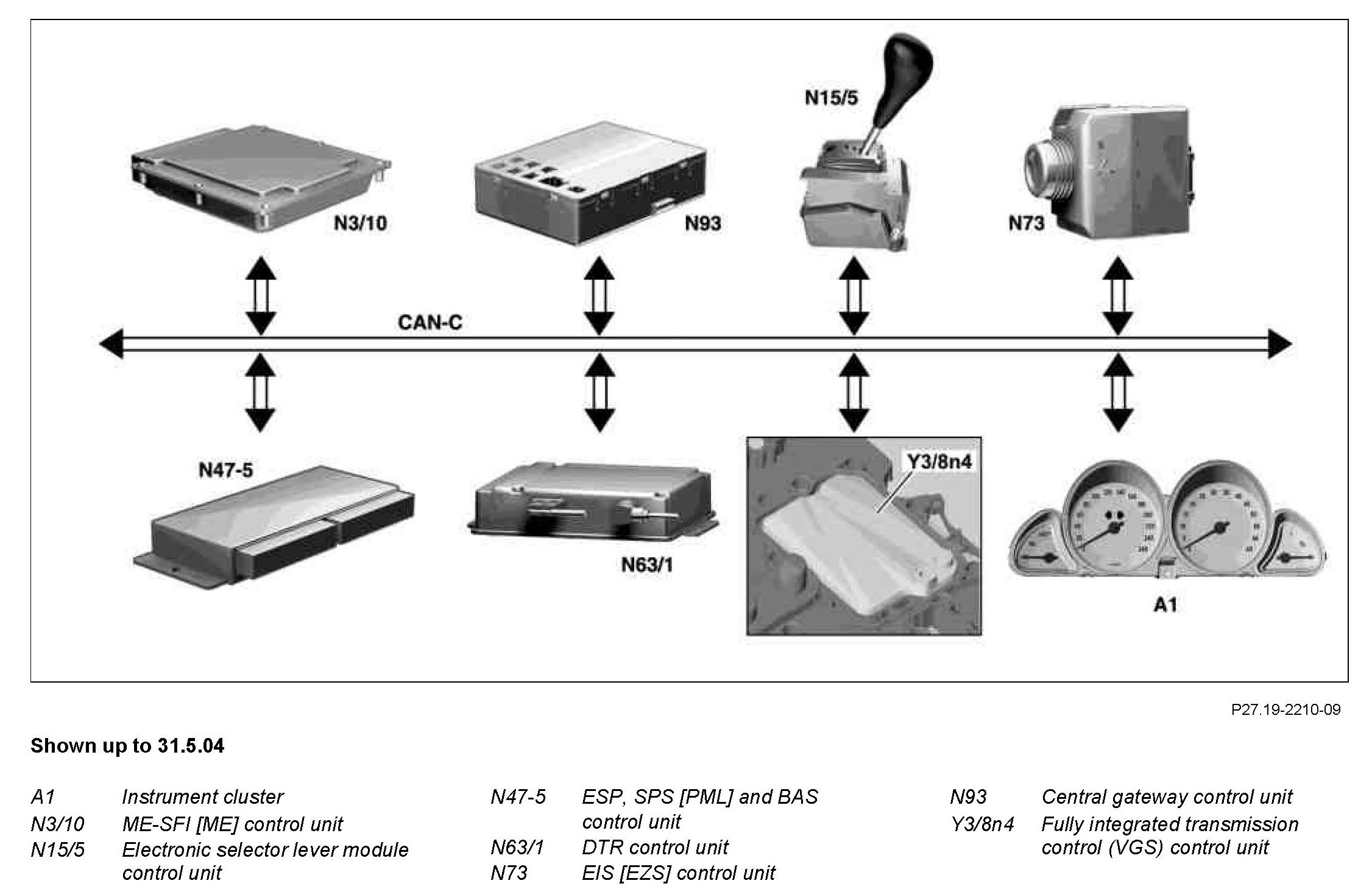 The electronic selector lever module control unit (N15/5) receives digital and analog input signals, converts these and actuates various components or transmits information to various control units via the Controller Area Network bus class C (engine compartment) (CAN-C).