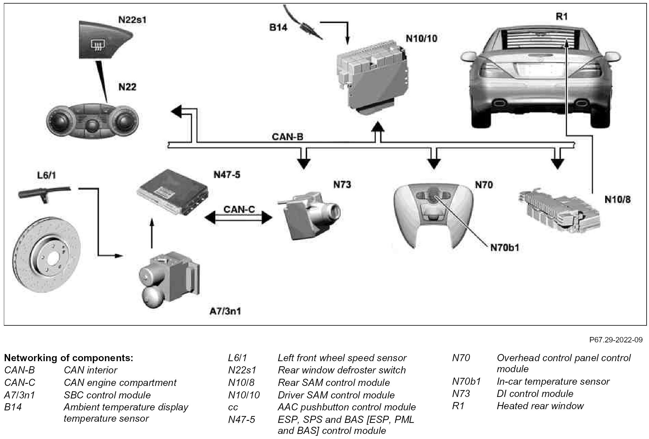 ^ The rear SAM control module (N10/8) receives the switch-on signal for the heated rear window function over the CAN interior from the AAC pushbutton control module (N22) The heated rear window (R1) rear is switched on via the window defroster relay (K40/5kU). This relay switches c. 30 through to the heated rear window (R1).