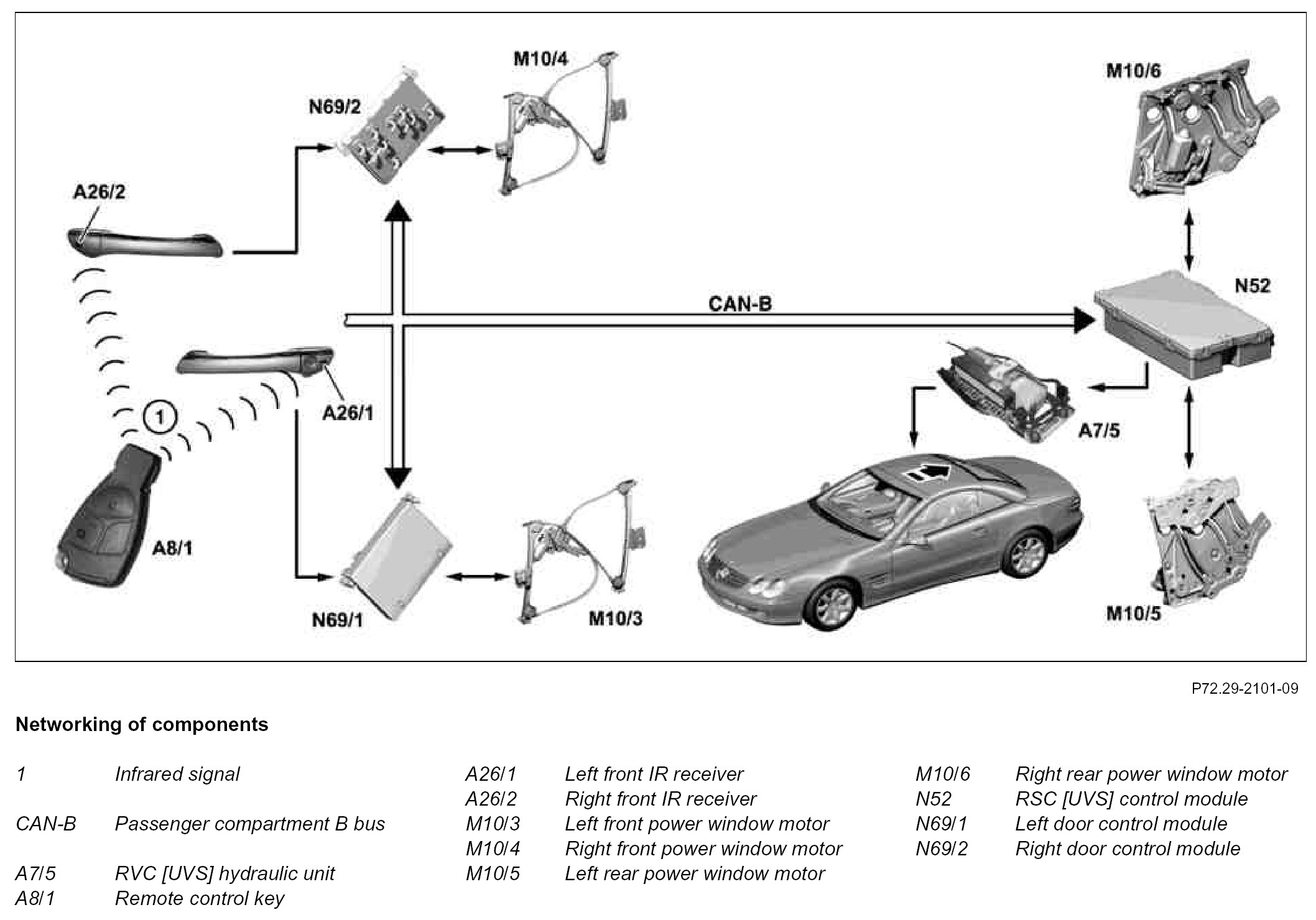 The RVC control module (N52) receives the CAN message for convenience opening and there upon actuates the RVC hydraulic unit (A7/5), which opens the Vario roof. At the same time, the rear left power window motor (M10/5) and right rear power window motor (M10/6) are activated, which lower the rear windows fully. If the Vario roof is opened, the windows of the driver and passenger door can be lowered fully by pressing again and holding down the unlock button on the remote control key (A8/1).