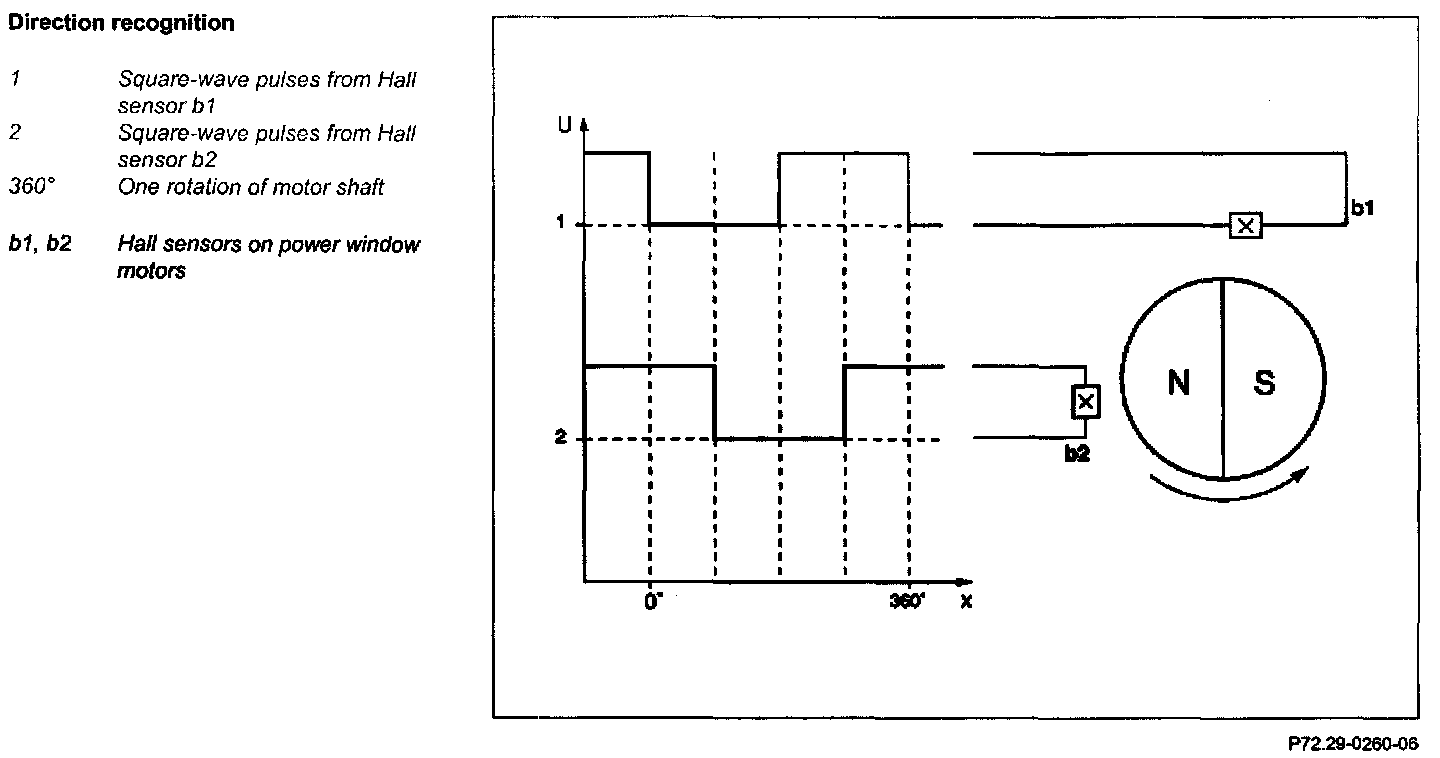 From the time difference between the pulses from Hall sensor (b1) and the pulses from Hall sensor (b2) the relevant control module recognizes the direction of rotation of the power window motor.