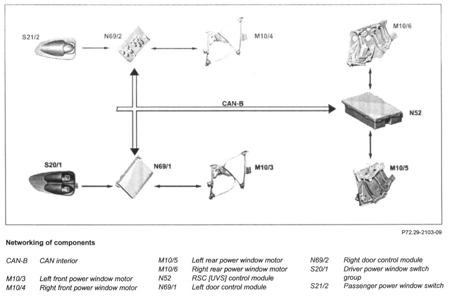 In the driver power window switch group (S20/1) the left power window switch (S20/1s1) and the right power window switch (S20/1s2) are integrated.They allow to operate the power windows on the driver and passenger side.