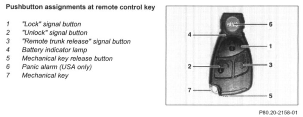 The remote control key consists of an electronic component and a mechanical key. The electronic component contains an FM radio transmitter, an infrared transmitter and receiver, a computer chip, the control buttons and two button cells (batteries).