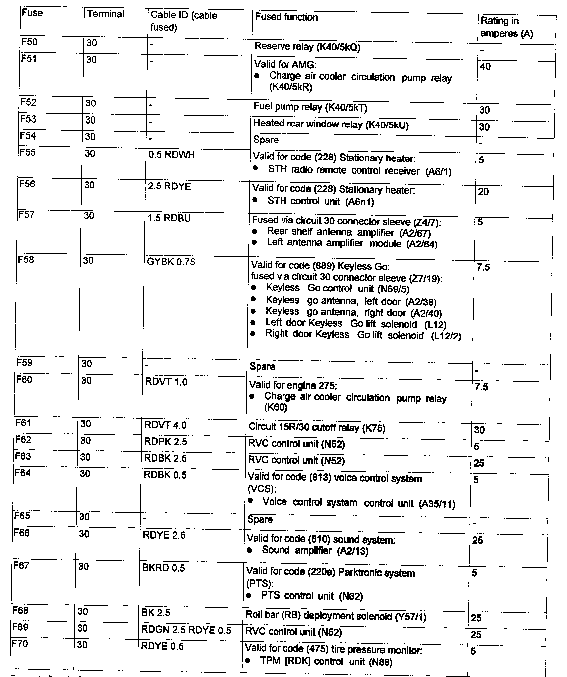 Assignment in the Fuse and Relay Box in the Right Engine Compartment