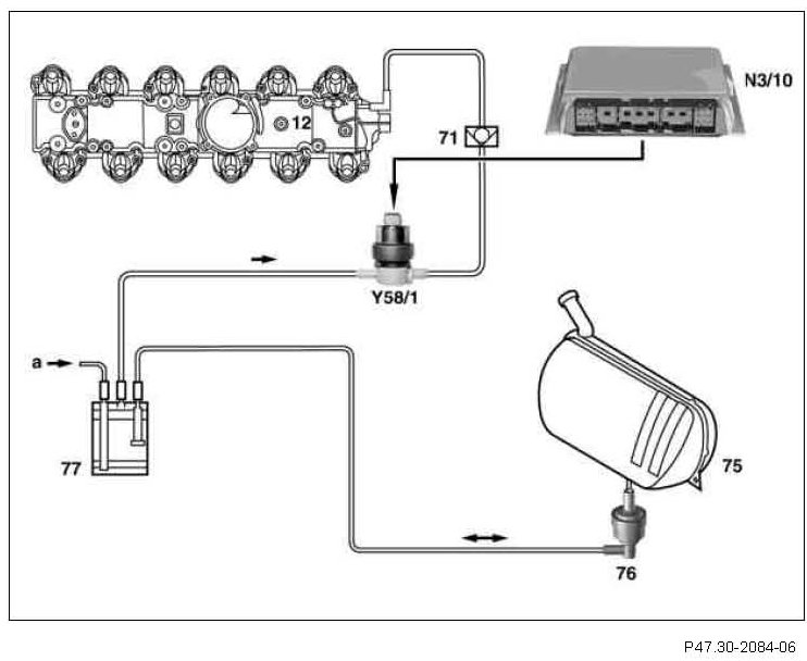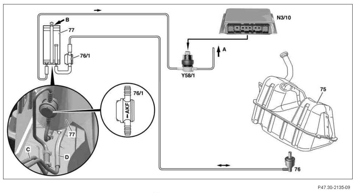 During refueling the fuel vapors are collected additionally from the fuel tank and passed on to the activated charcoal filter (ORVR = Onboard Refueling Vapor Recovery). An activated charcoal canister of about 3 l capacity is used, with a connection for the ORVR vent line. The activated charcoal canister shutoff valve (Y58/4) and fuel tank pressure sensor (B4/3) are necessary for the checking the leaktightness.