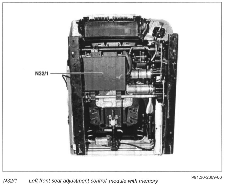 Side left front seat adjustment with memory control module (N32/1) is located below the driver seat.