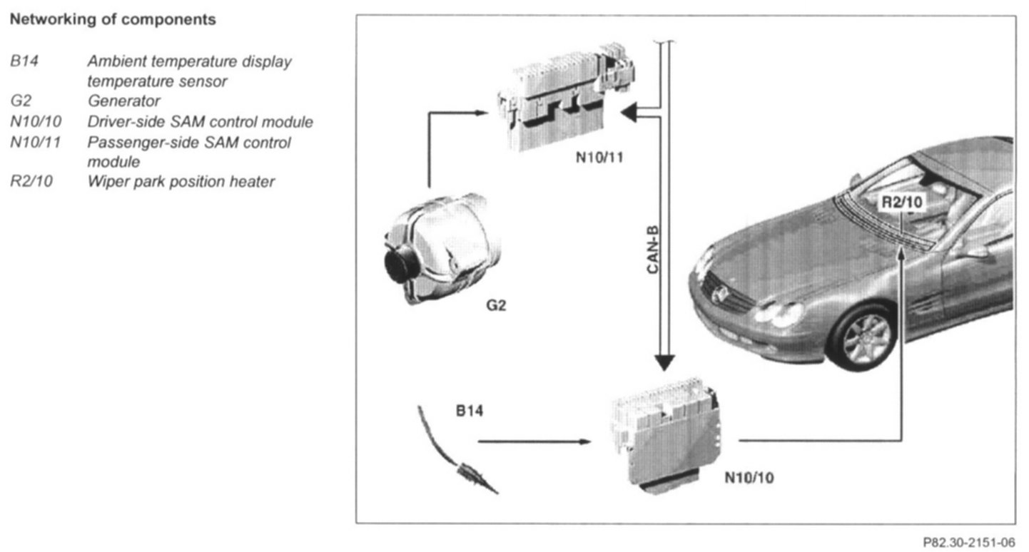 If the switch-on conditions are fulfilled, the driver-side SAM control module (N10/10) controls the wiper park heater relay (K40/2kA) by connecting c. 30 through to the wiper park heater (R2/10).