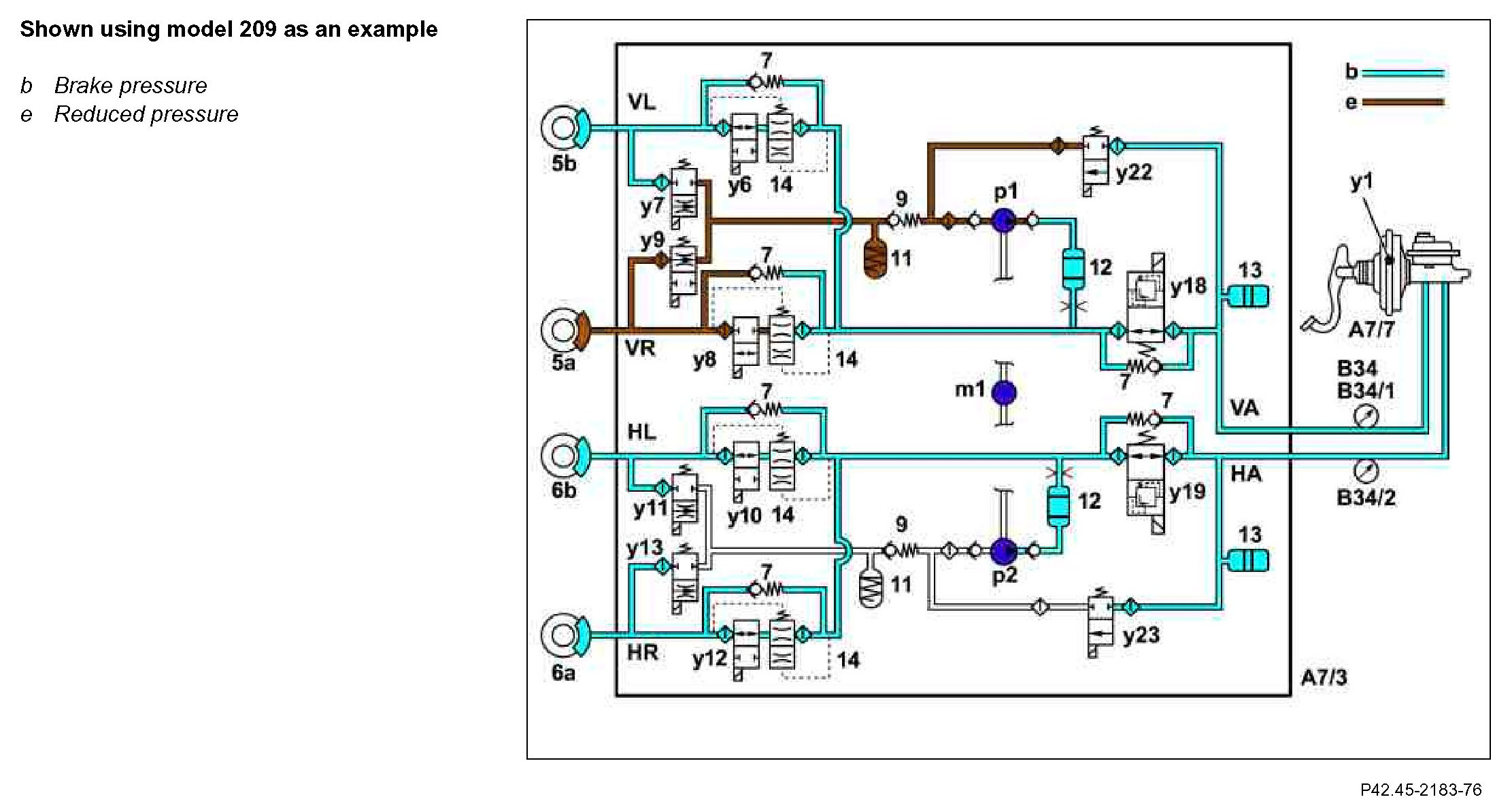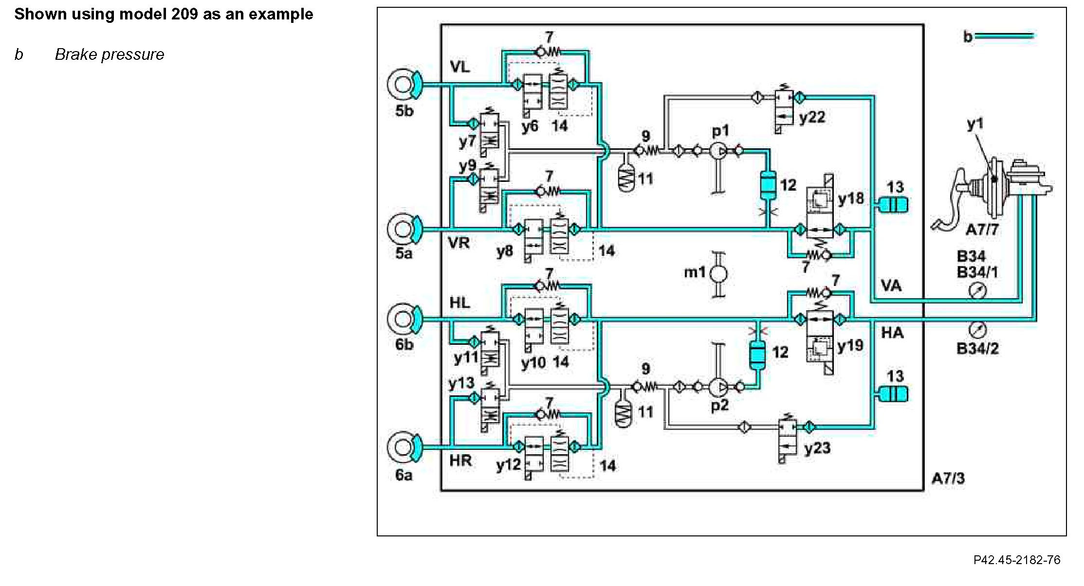 The brake pressure is built up via the two change-over solenoid valves (y18 and y19) and the solenoid valves (y6, y8, y10 and y12).