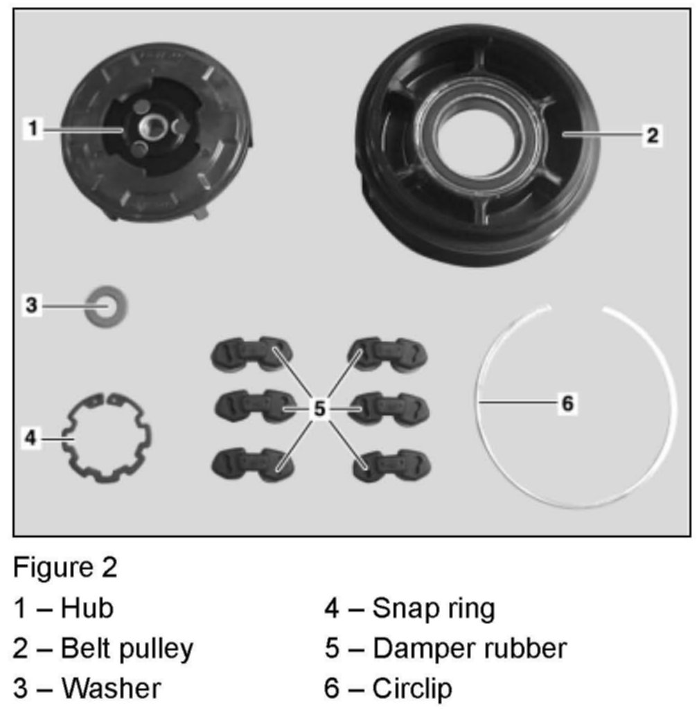 12. Refer to Figure 2 for component number references. Remove the belt pulley circlip (Figure 2, Part 6). With plastic belt pulleys, it is possible to insert a screwdriver under the circlip (Figure 2, Part 6) and pry it out of the groove.
