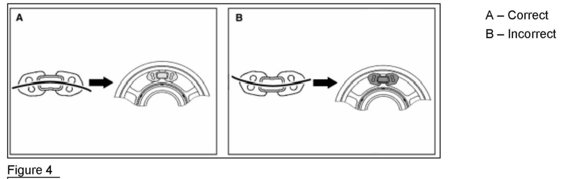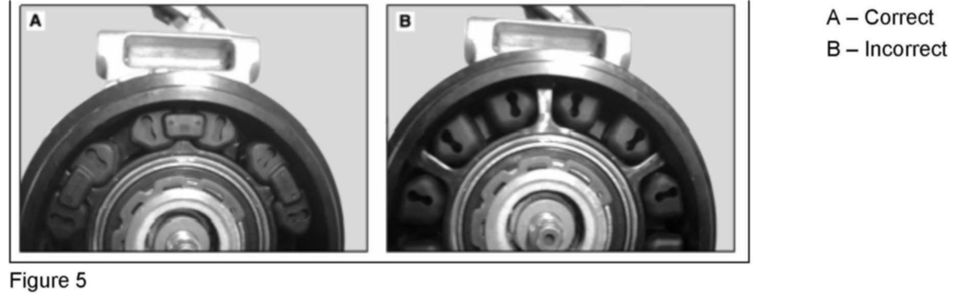 Assemble the rubber dampers (Figure 2, Part 5) into new pulley the as shown in example A in Figure 4 and Figure 5. Make note of the direction of the curvature of the rubber dampers and install them over the reinforcing webs in the pulley, not in the spaces between the webs.