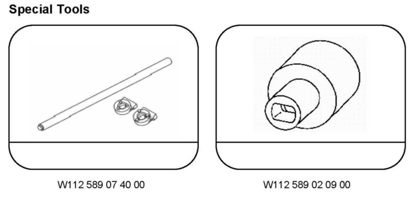 There are two versions of the compressor shaft, a 7mm hex and one with two flats. The shaft with two flats requires the use of socket W112 589 02 09 00. To loosen 7mm hex head, ensure that proper METRIC tool is utilized. To loosen the pulley: