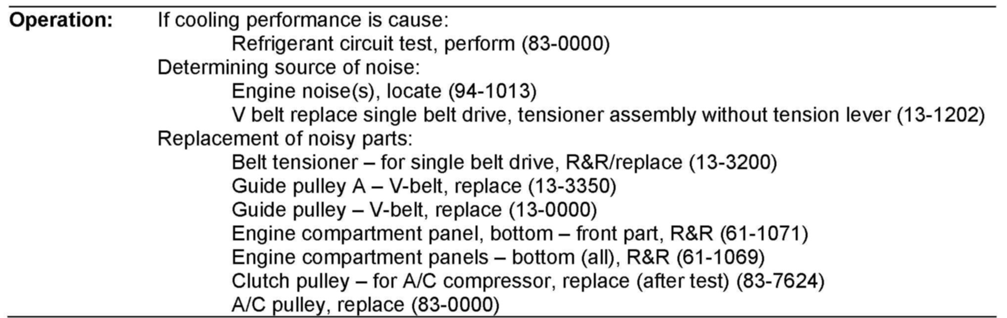 Replacement of Refrigerant Compressor Belt Pulley Due to Noise Complaints If you receive customer reports in the above model vehicles of noises at the refrigerant compressor with air conditioning activated and deactivated, the cause could be a defective belt pulley or belt pulley bearing. The pulley and pulley bearing can be diagnosed and replaced with the compressor still installed in the vehicle by following the procedures below.