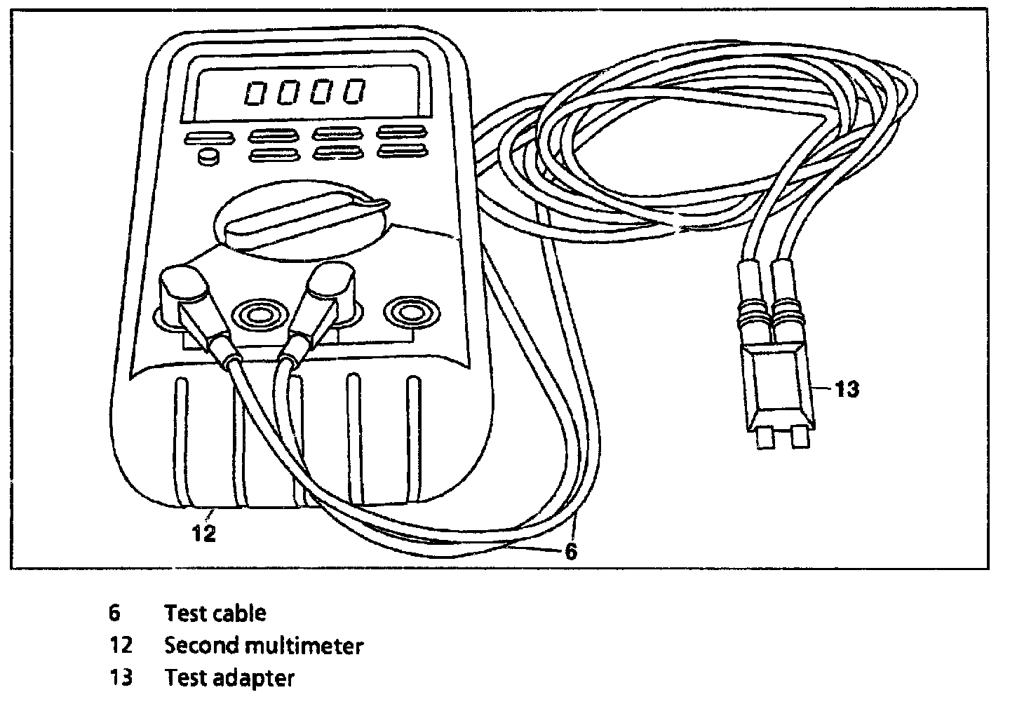 7 Connect test cable (6) and test adapter (13) to a second multimeter (12) (amps mode).