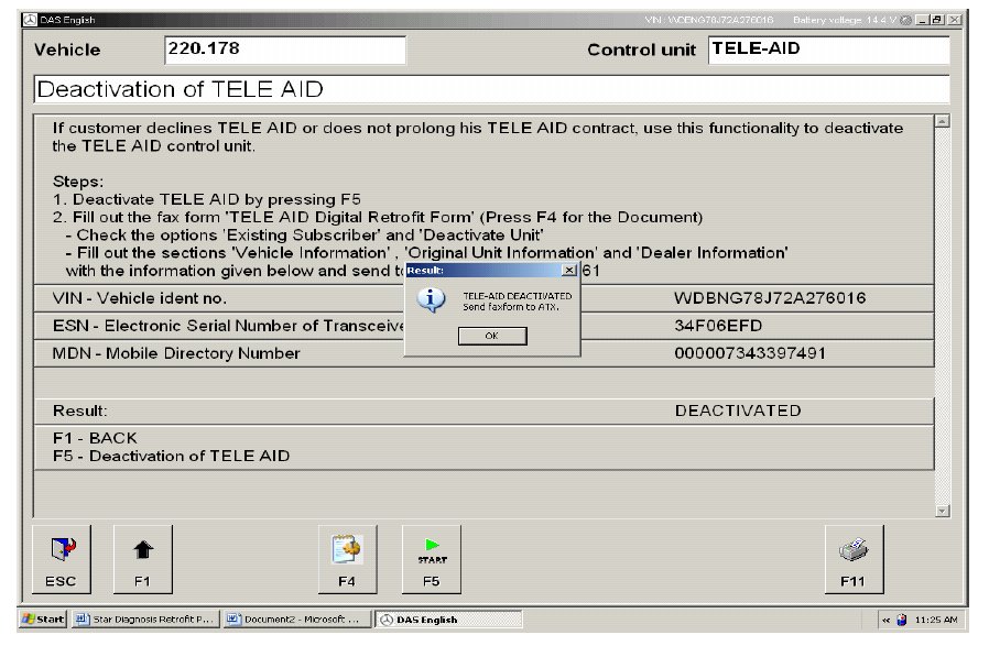 Deactivating Tele Aid requires the vehicle information be manually entered via Star Diagnosis. Since it is the same Tele Aid control module, it is not necessary to fax ATX another activation form.*