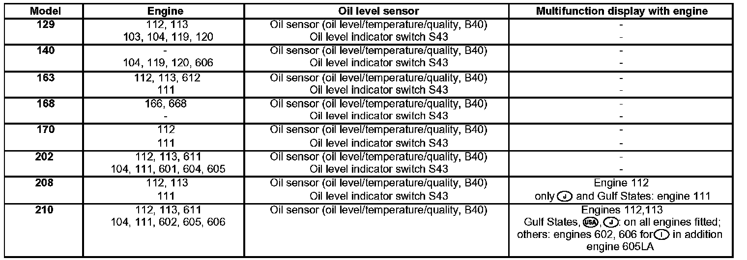 The table below (status: March 1999) lists the various vehicle models with the different engines and the different oil level sensors.