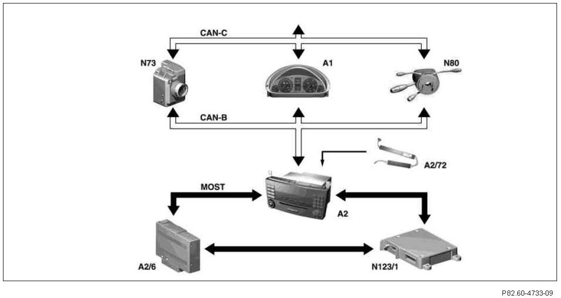 The control signals from the radio (A2) as well as the audio data from the CD player with changer (in the glove compartment) (A2/6) are transmitted by the Media Oriented System Transport (MOST). The signals are processed and amplified by the radio (A2) or the sound amplifier (A2/13) (models 203.05/09/75 with code (810) Sound system).