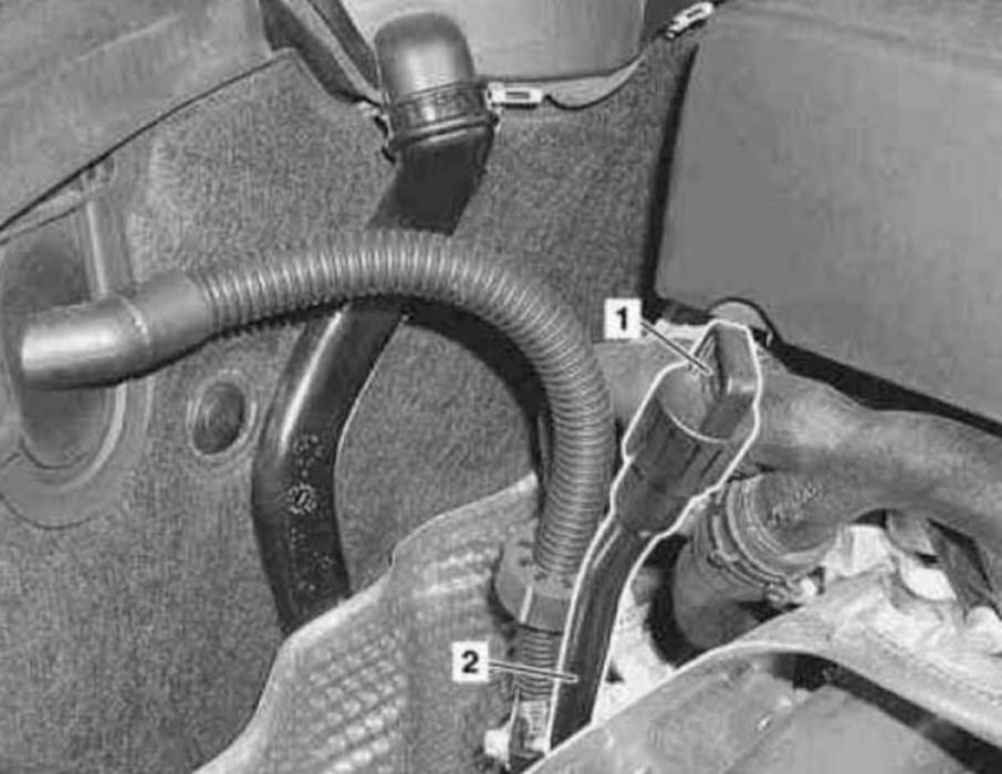 4 Unplug plug (1) of oil dipstick guide tube (2).