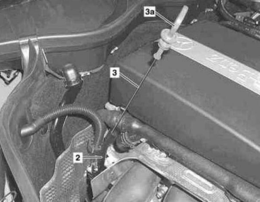 The collar of the grip end (3a) sits close at the oil dipstick guide tube (2).