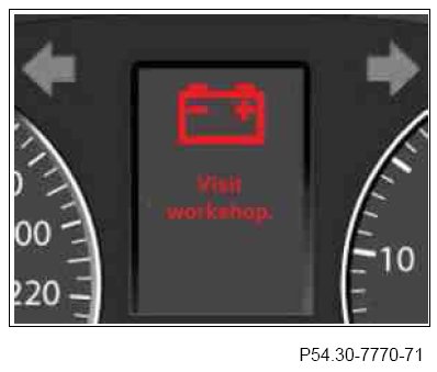 - If in addition a fault occurs in the alternator (G2), the category 2 warning message which requests locating a workshop is displayed (see picture 2). This warning message hides the first warning message due to its higher priority.