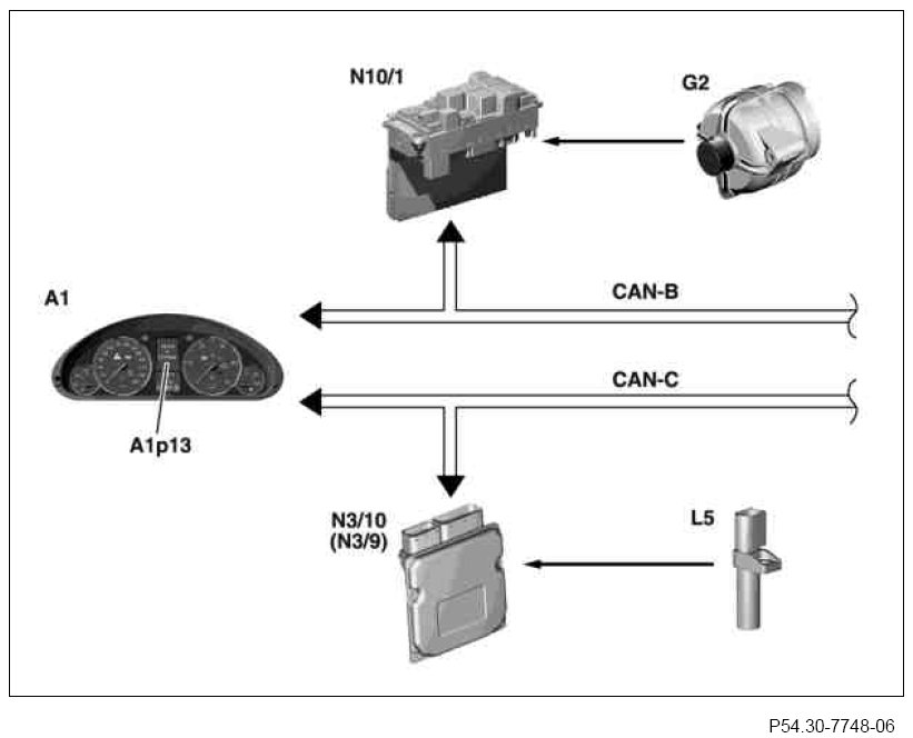 The circuit 61e CAN message is required by the CDI control unit (N3/9) or the ME control unit (N3/10) and by the ESP and BAS control unit (N47-5).