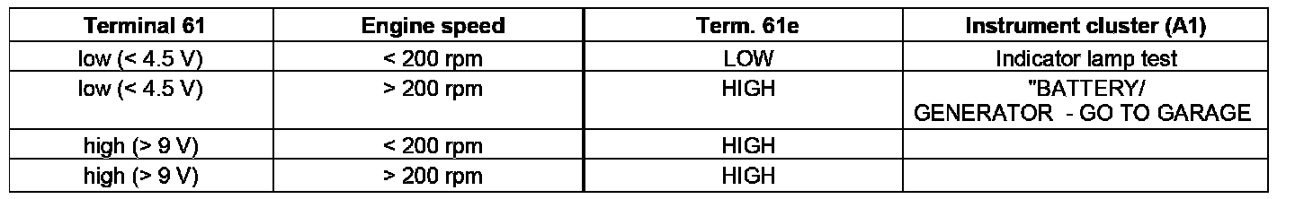 The circuit 61e CAN message can have the status "HIGH" or "LOW". It is "LOW" precisely when the voltage which is applied to circuit 61 is < 9 V and the engine speed is < 200 rpm. In all other cases the message status is "HIGH".