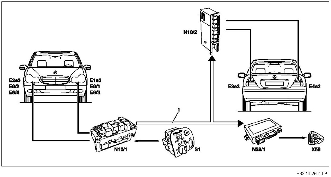 3 The rear SAM control unit with fuse and relay module (N10/2) actuates the taillights and parking lights (E3e2 and E4e2).