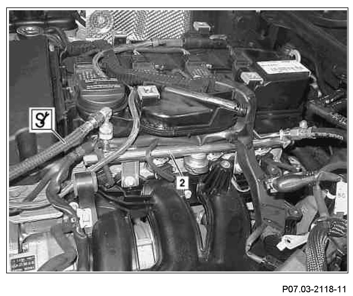 2 Connect pressure hose to service valve on fuel distributor (2).
