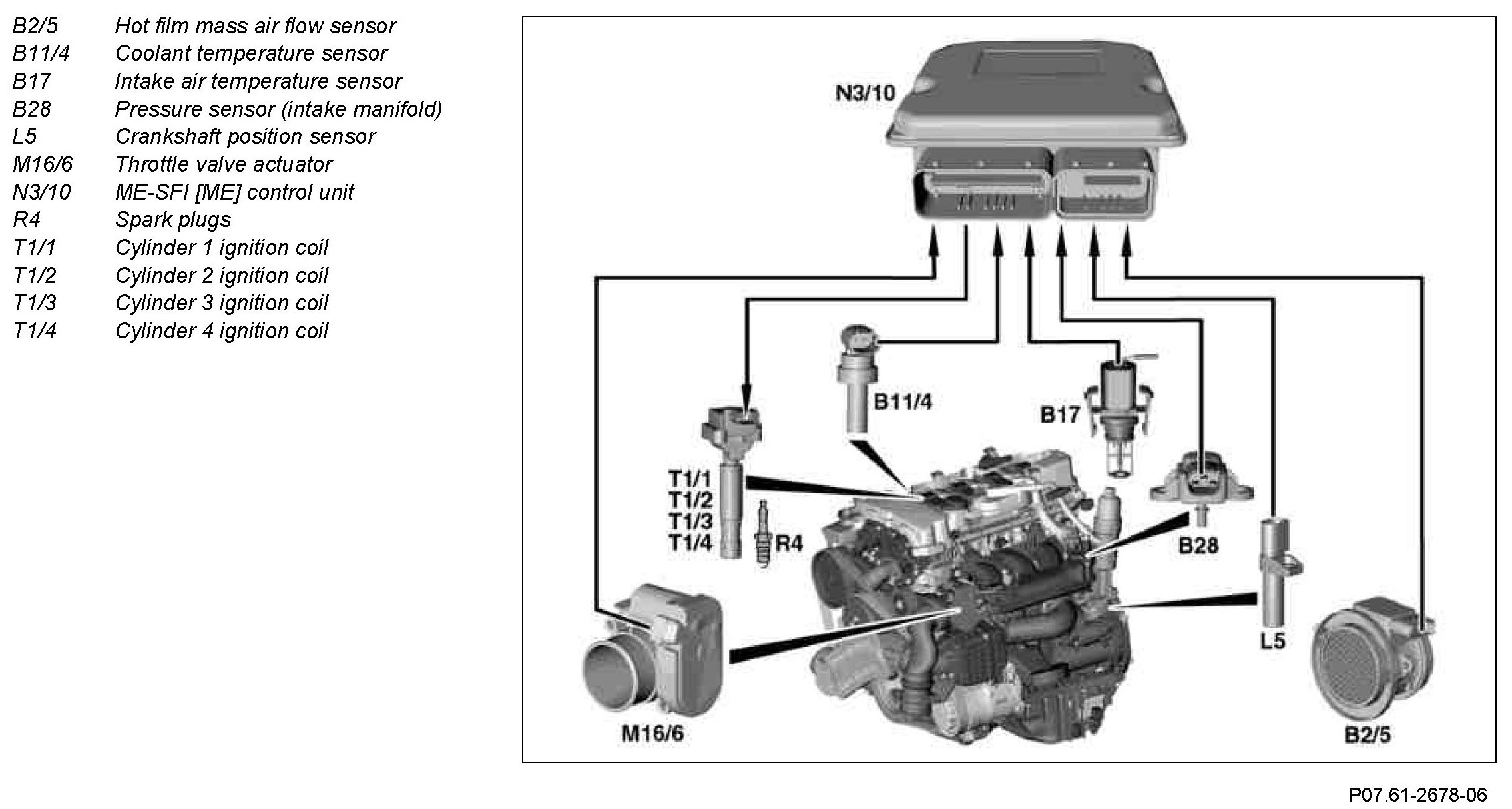 If the coolant temperature/charge air temperature is too high, the ignition timing point is retarded in line with engine speed and load. The correction by retarding the ignition timing is map-controlled by the ME control unit.