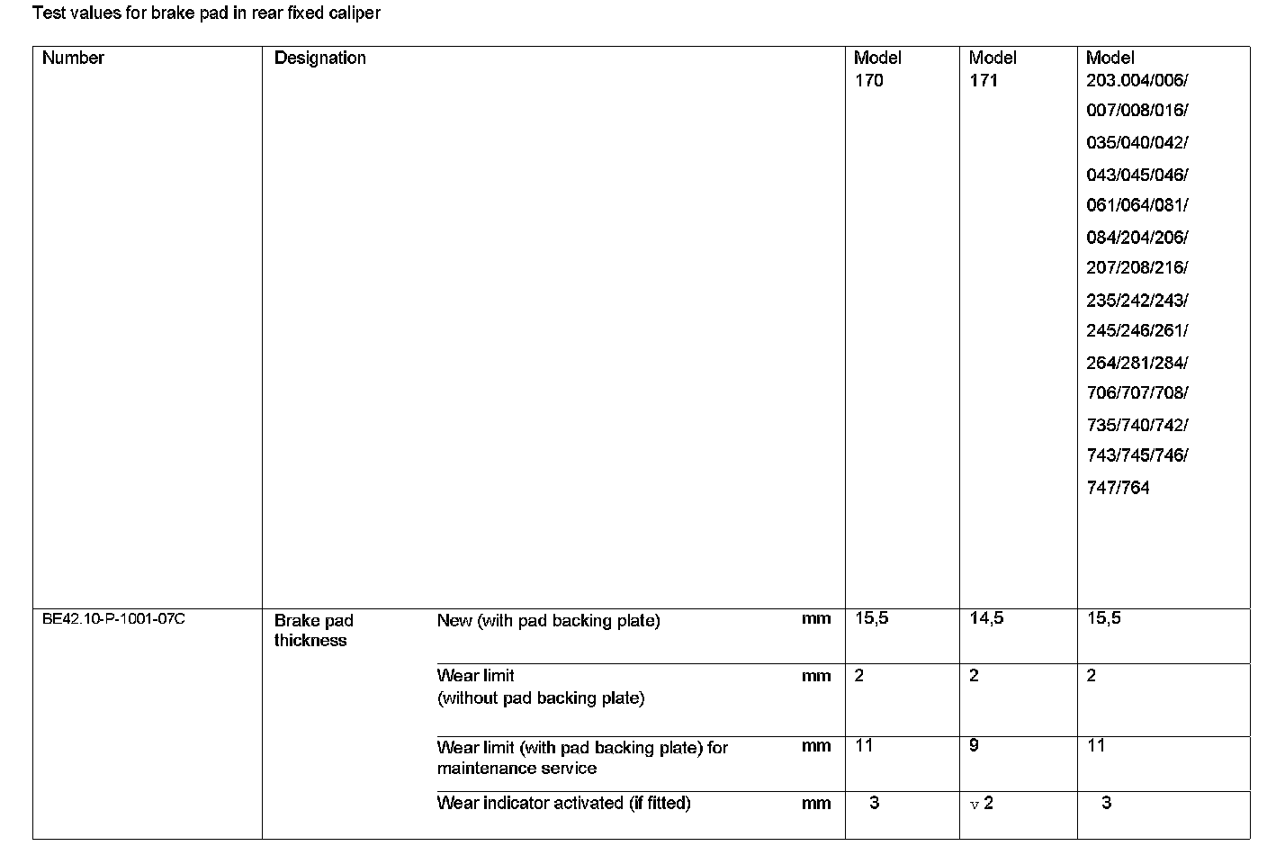 BE42.10-P-1000-07C Test Values For Brake Pad In Rear Fixed CaliperModification Notes: