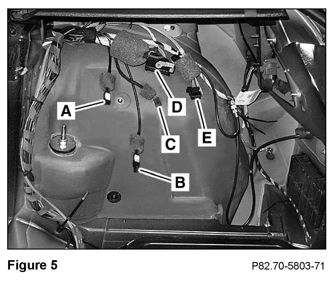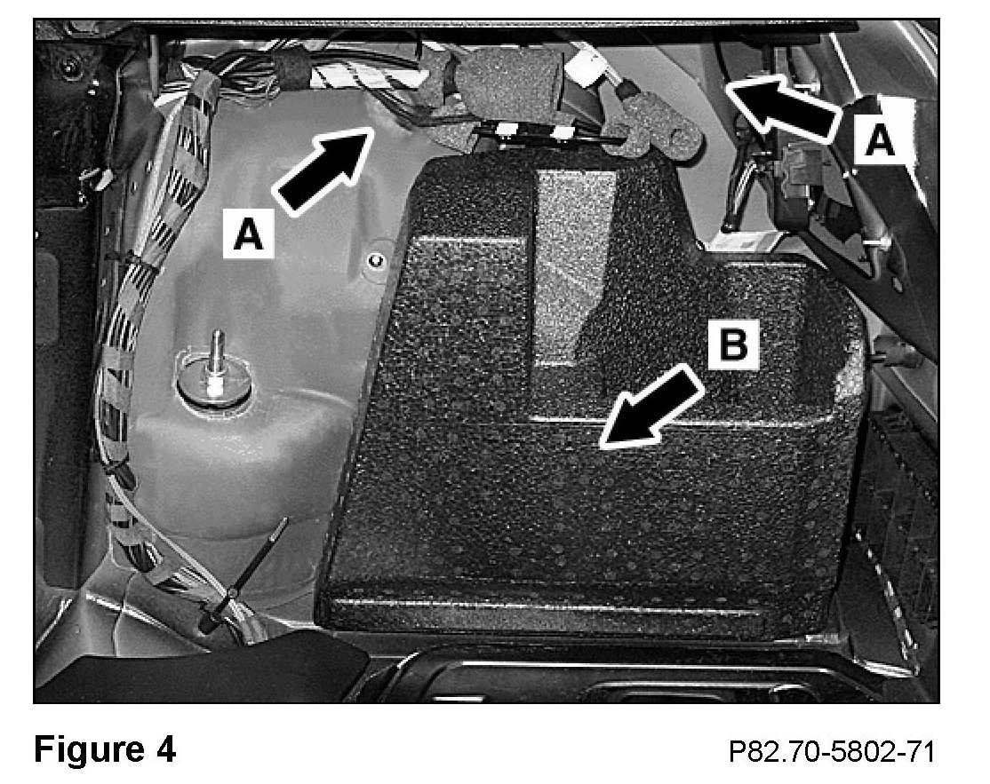 C. Locating the cable connectors-without sound system1. In the exposed right side of the cargo compartment, find the foam-sleeve-covered cable connectors (A, Figure 4) atop the Styrofoam(R) panel.