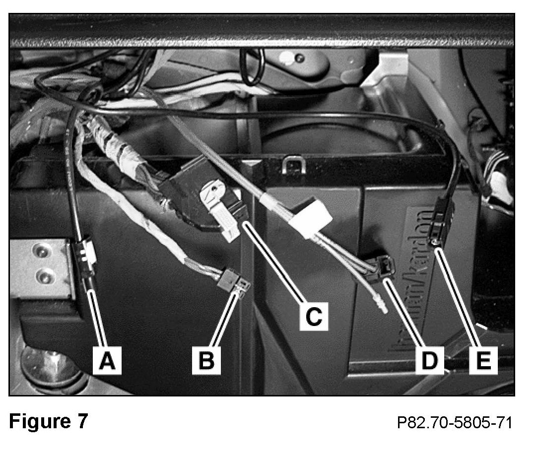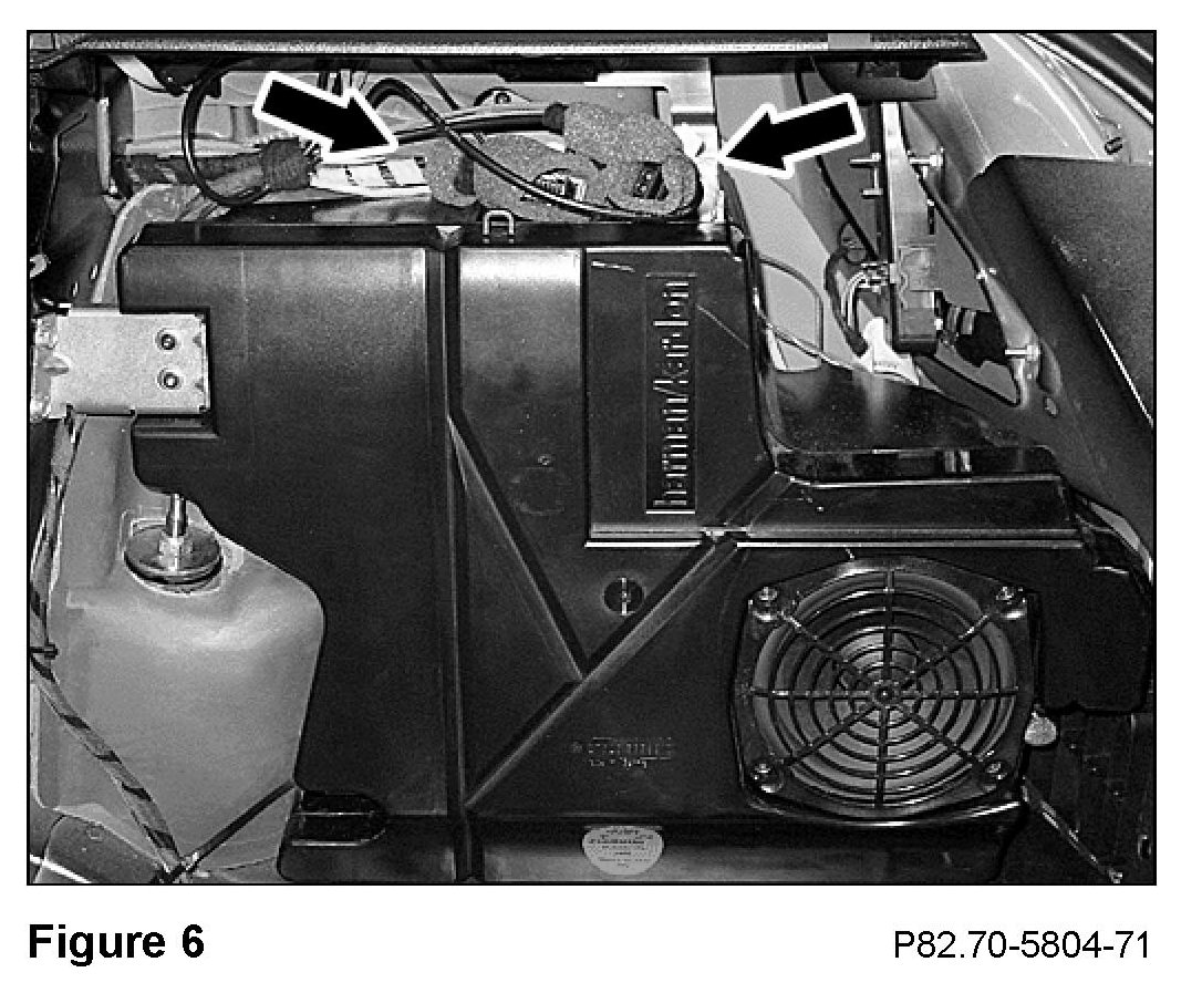 D. Locating the cable connectors-with sound system1. In the exposed right side of the cargo compartment, find the foam-sleeve-covered cable connectors atop the harmon/kardon(R) sub-woofer assembly (Figure 6).