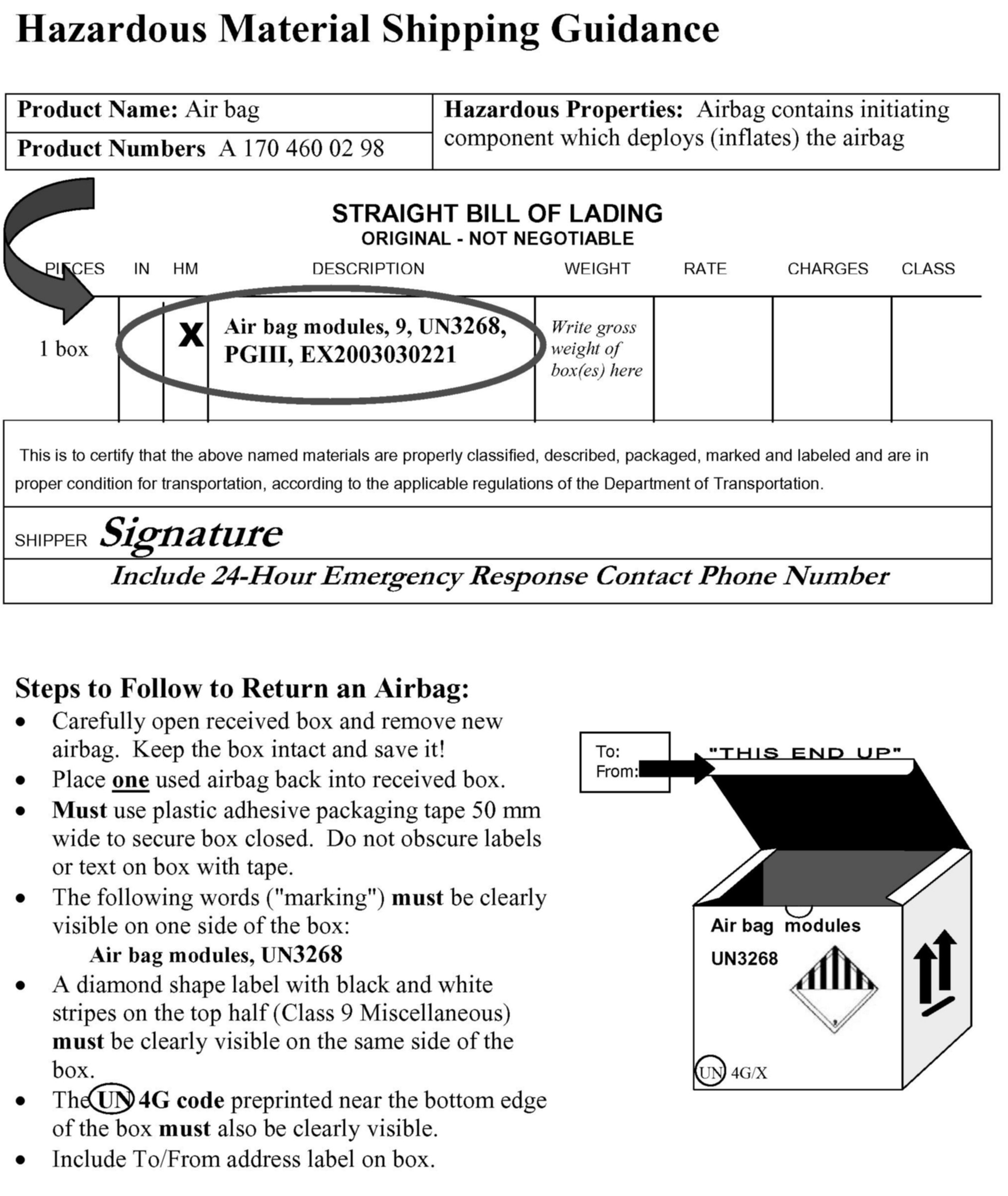 ^ The shipping of airbag modules, a hazardous material, must be done in accordance with the rules and regulations in Title 49 CFR (the U.S. Department of Transportation's Hazardous Materials Shipping Regulations). Refer to the "Hazardous Materials Shipping/Guidance" section shown to assist you on how to properly mark label package and document this hazardous material for transportation.