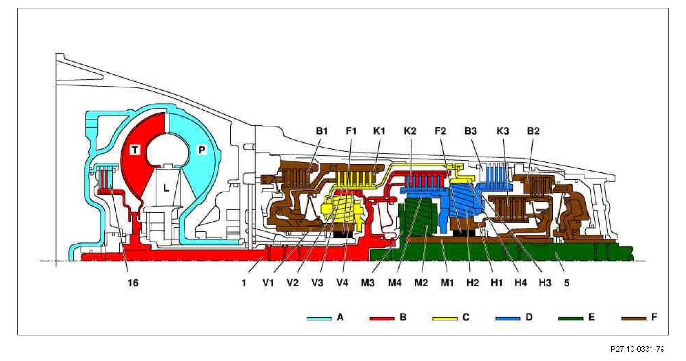 The input shaft (1) drives the internal gear (V4). In drive mode the sun gear (V1) is supported via the locked freewheel F1 and in overrun mode via the engaged front multi-disk brake (B1) in the housing (B1). The planet gears (V2) roll over the fixed sun gear (V1) and provide an increase in torque between the internal gear (V4) and the planet carrier (V3). The planet carrier (V3) moves at reduced speed in the direction of engine rotation.