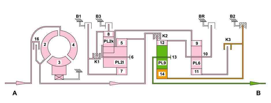 The rpm of the ring gear (9) and ring gear (12) is the same due to the engaged multi-disk clutch K2 (K2). As a result the single rear planetary gear system is locked and not actively involved in the gear ratio.