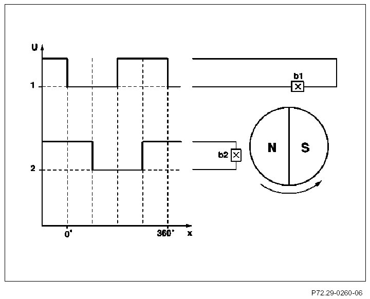 there are two hall sensors each (b1, b2). These Hall sensors respond to the movement of the magnet and each transmits one square-wave pulse for each rotation of the motor shaft. The corresponding: