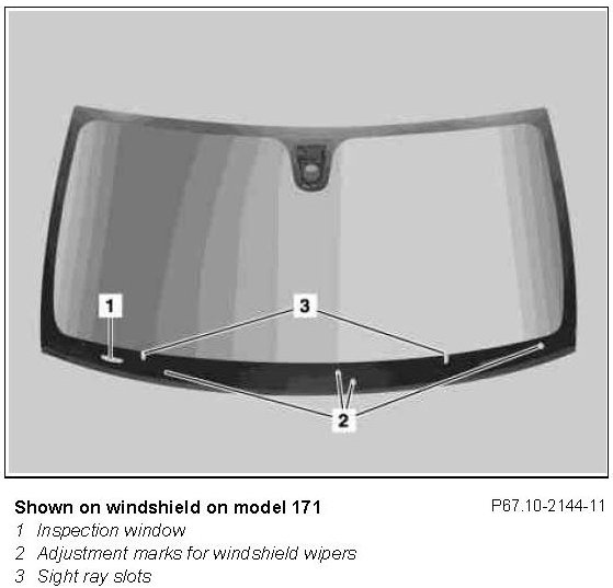 Do not apply primer, e.g. from repair kit, to adjustment marks for windshield wipers (2) and sight ray slots (3) in the lower area of screen print.