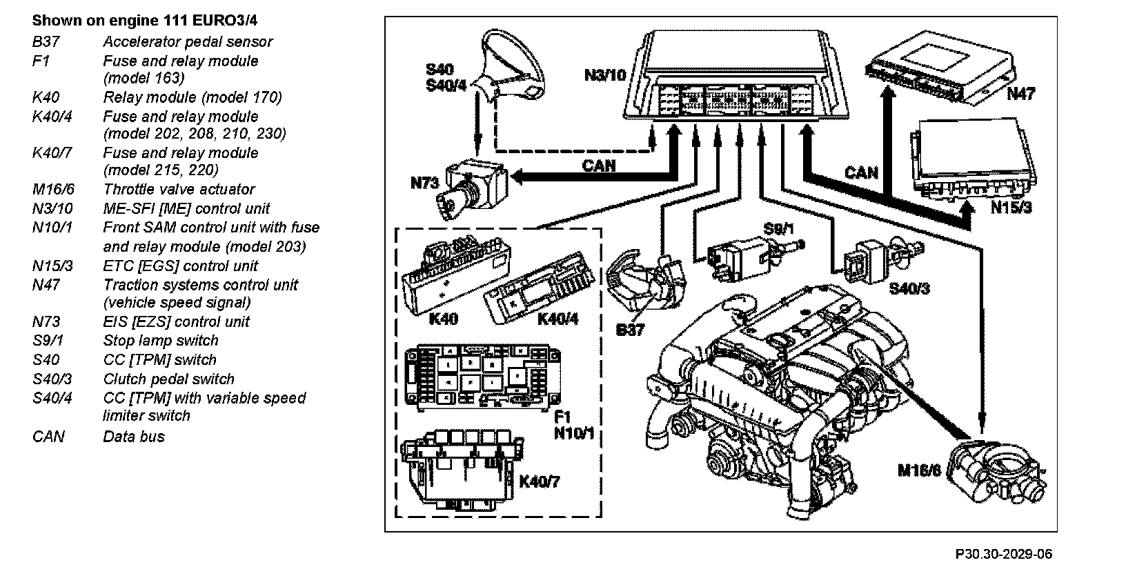 The signals from the pushbutton switch for the cruise control are detected by the control unit EIS and transmitted to the CAN data bus.