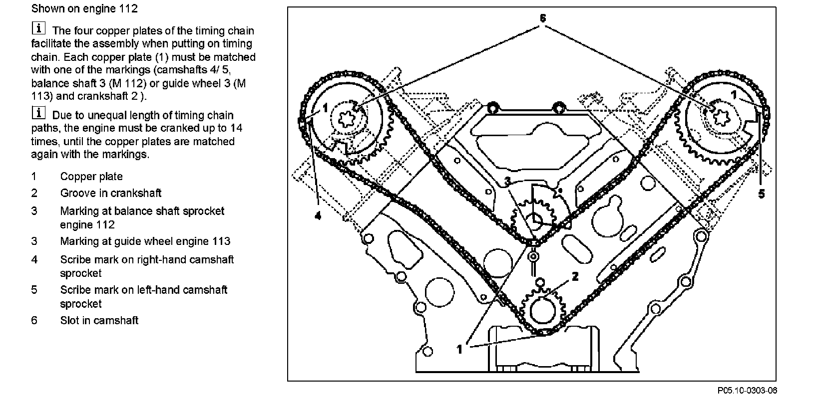 The four copper plates of the timing chain facilitate the assembly when putting on timing chain. Each copper plate (1) must be matched with one of the markings (camshafts 4/ 5, balance shaft 3 (M 112) or guide wheel 3 (M 113) and crankshaft 2).