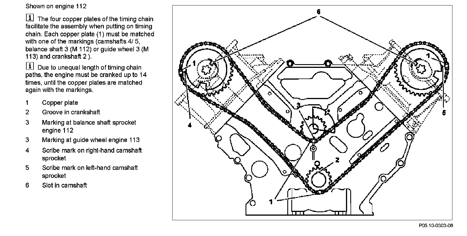 The four copper plates of the timing chain facilitate the assembly when putting on timing chain. Each copper plate (1) must be matched with one of the markings (camshafts 4/ 5, balance shaft 3 (M 112) or guide wheel 3 (M 113) and crankshaft 2).