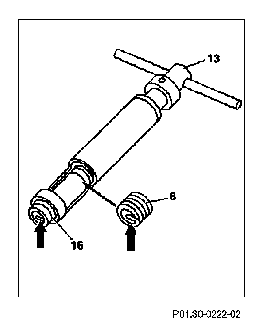 6. Screw in threaded insert (8) flush to prestessing cartridge (16) (arrow).