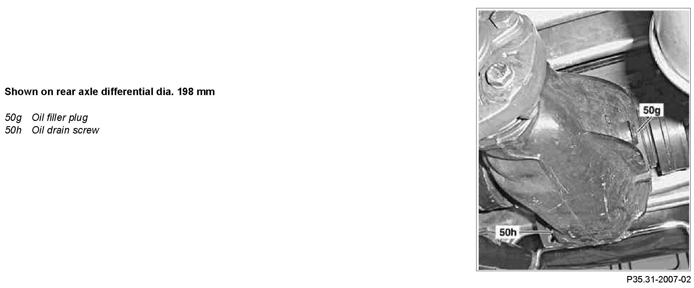 5 Screw oil drain screw (50h) immediately into the rear axle differential and tighten with specified torque.