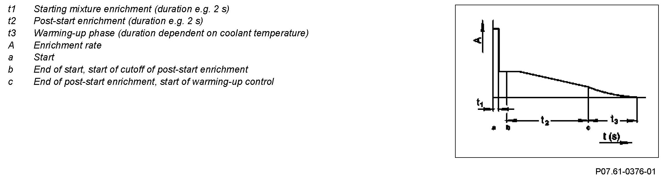After start- and post-start enrichment the air/fuel mixture is further enriched by the warming-up control as part of the air/fuel mixture precipitates on the parts of the engine which are still cold.