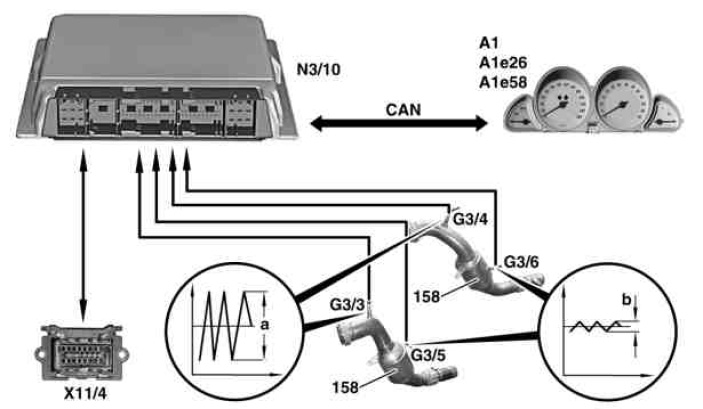 Each catalytic converter is evaluated on the basis of its ability to store oxygen. When the catalytic converter is at operating temperature and the lambda control is activated, the voltage signal of the O2 sensor downstream of TWC is compared with the O2voltage signal upstream of catalytic converter (amplitude size).